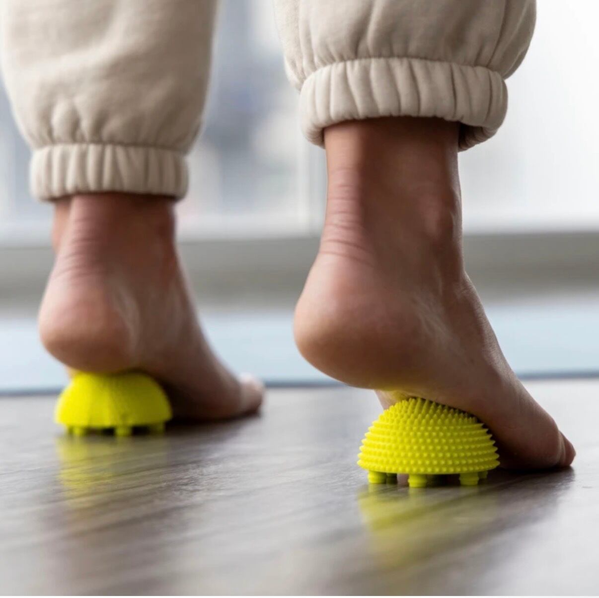 踏む:ボールを半分に分けて踏むことで、足裏全体にしっかりとした刺激を与え、感覚の目覚めをサポート。