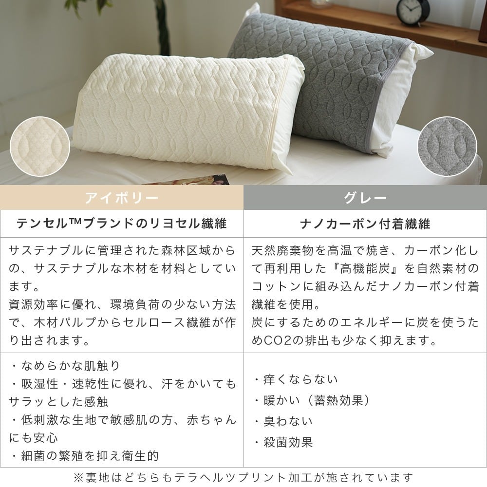表地にナノカーボン付着繊維を使用した枕パッド(グレー)は、天然廃棄物を高温で焼き、カーボン化した『高機能炭』を自然素材のコットンに組み込むことで消臭・殺菌・蓄熱効果などが得られます。